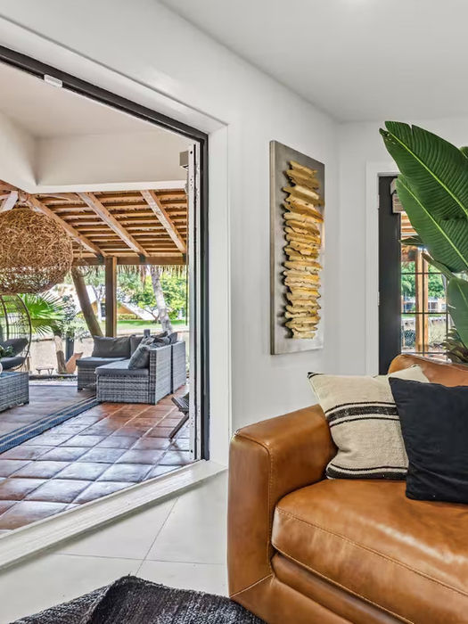 tucked away on a quiet cul-de-sac in Fort Lauderdale, surrounded by lush palms and mature trees that create a private, tropical atmosphere. The riverfront setting attracts iguanas, ducks, and other wildlife, making it feel like your own hidden retreat.